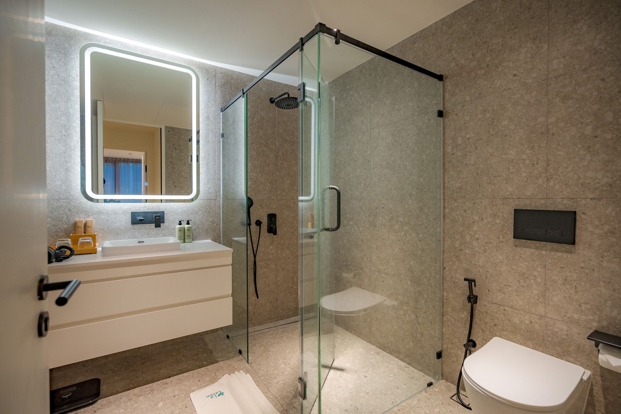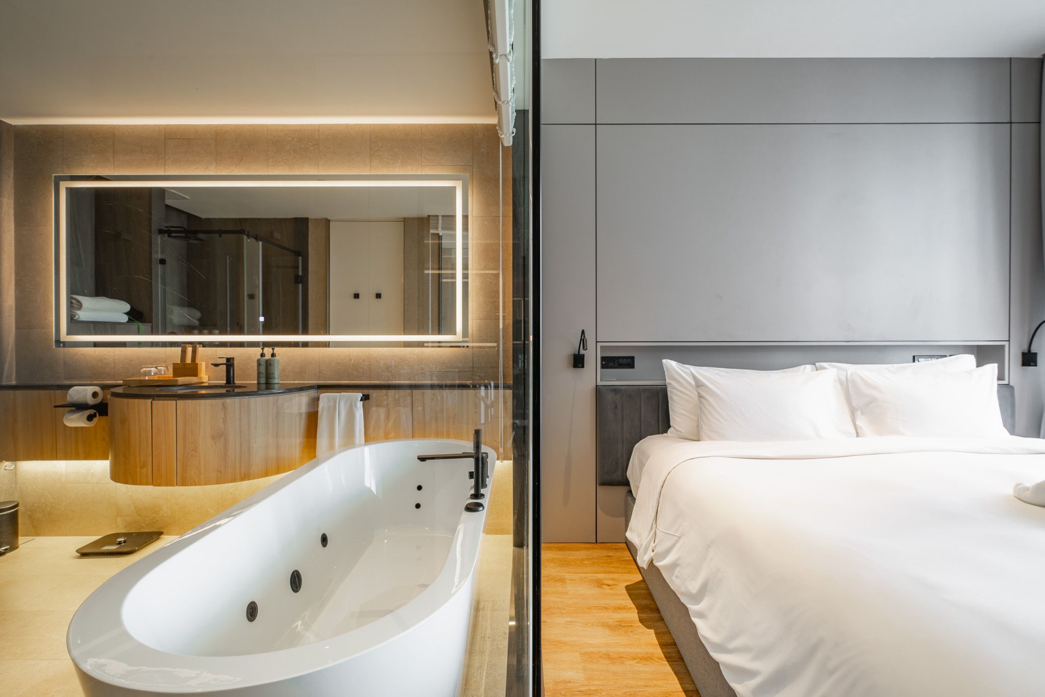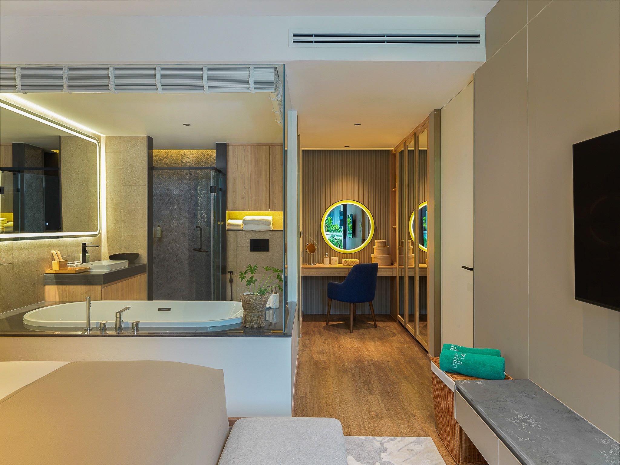 В люксе 2 спальни, гостиная с кухней, 2 ванные комнаты с душем и ванной, 2 балкона. Первая комната включает двуспальную кровать или две односпальные кровати, вторая — две односпальные кровати. В удобства включены Wi-Fi, кондиционер, телевизор, сейф, фен, туалетно-косметические принадлежности, утюг, зонтик, чайно-кофейный набор.