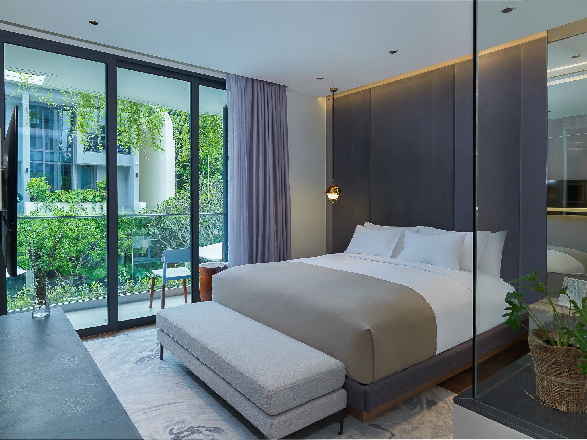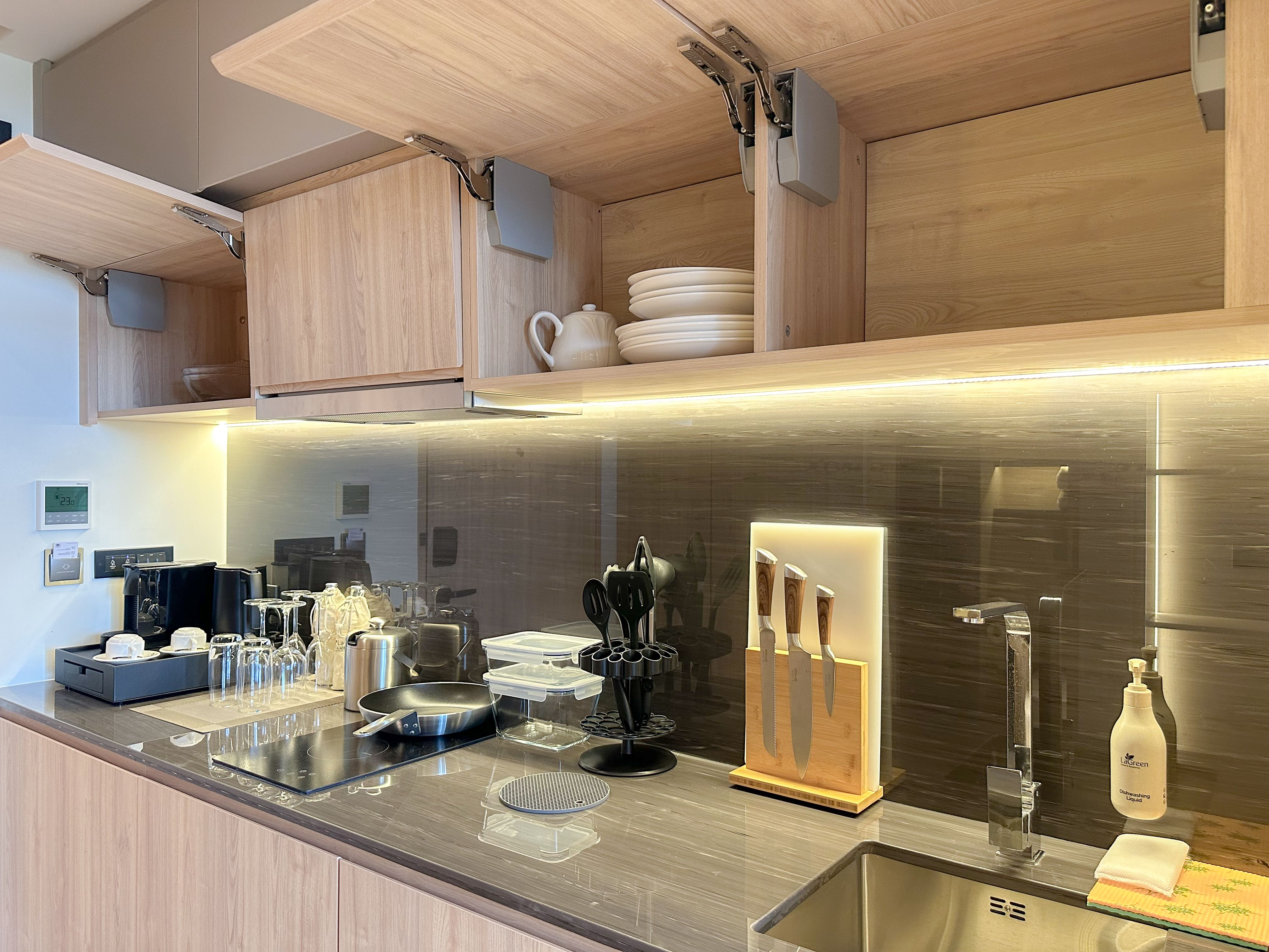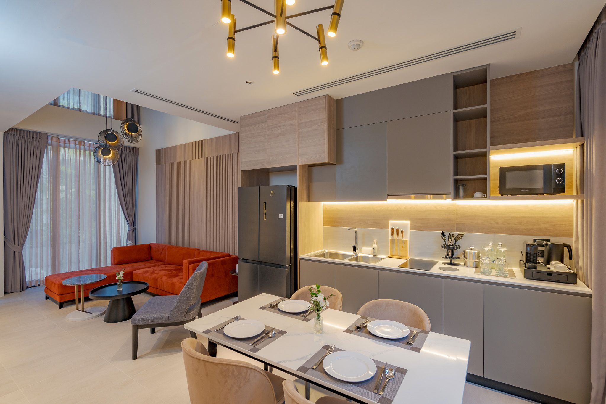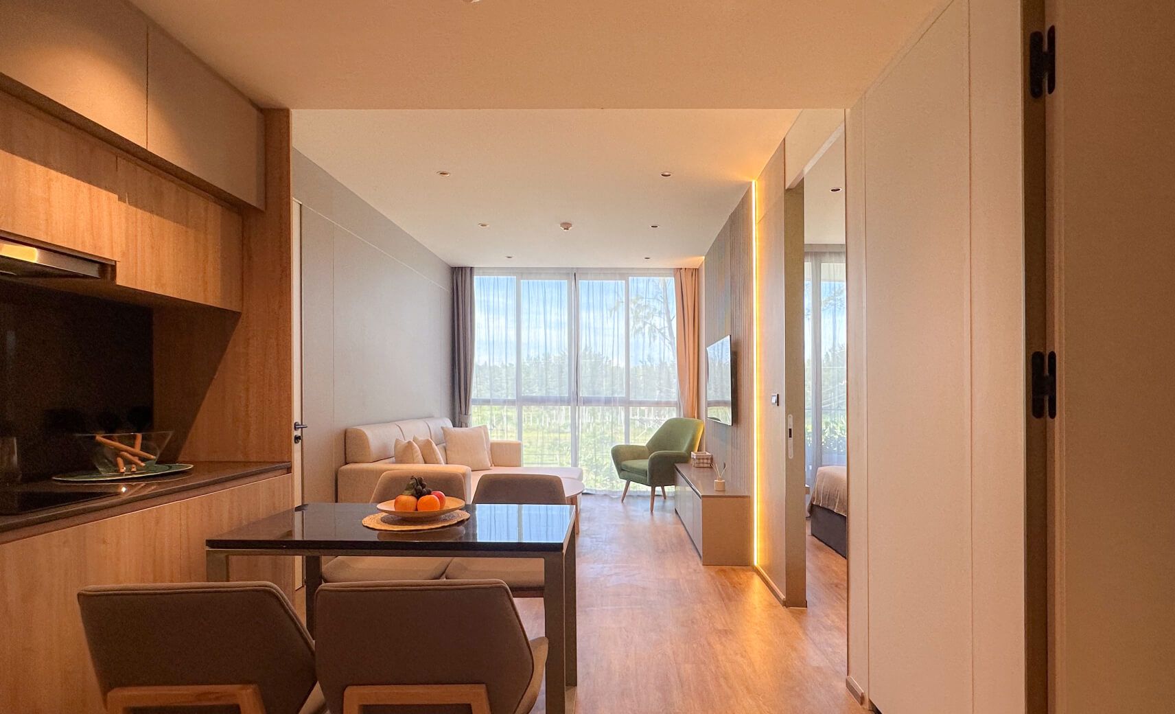Номер включает спальню с двуспальной кроватью/2 односпальными кроватями, балкон и гостиную с кухней. Ванная комната оснащена душем, феном, туалетно-косметическими принадлежностями. В числе прочих удобств кондиционер, телевизор, зонтик, сейф, утюг, чайно-кофейный набор, халаты и тапочки.