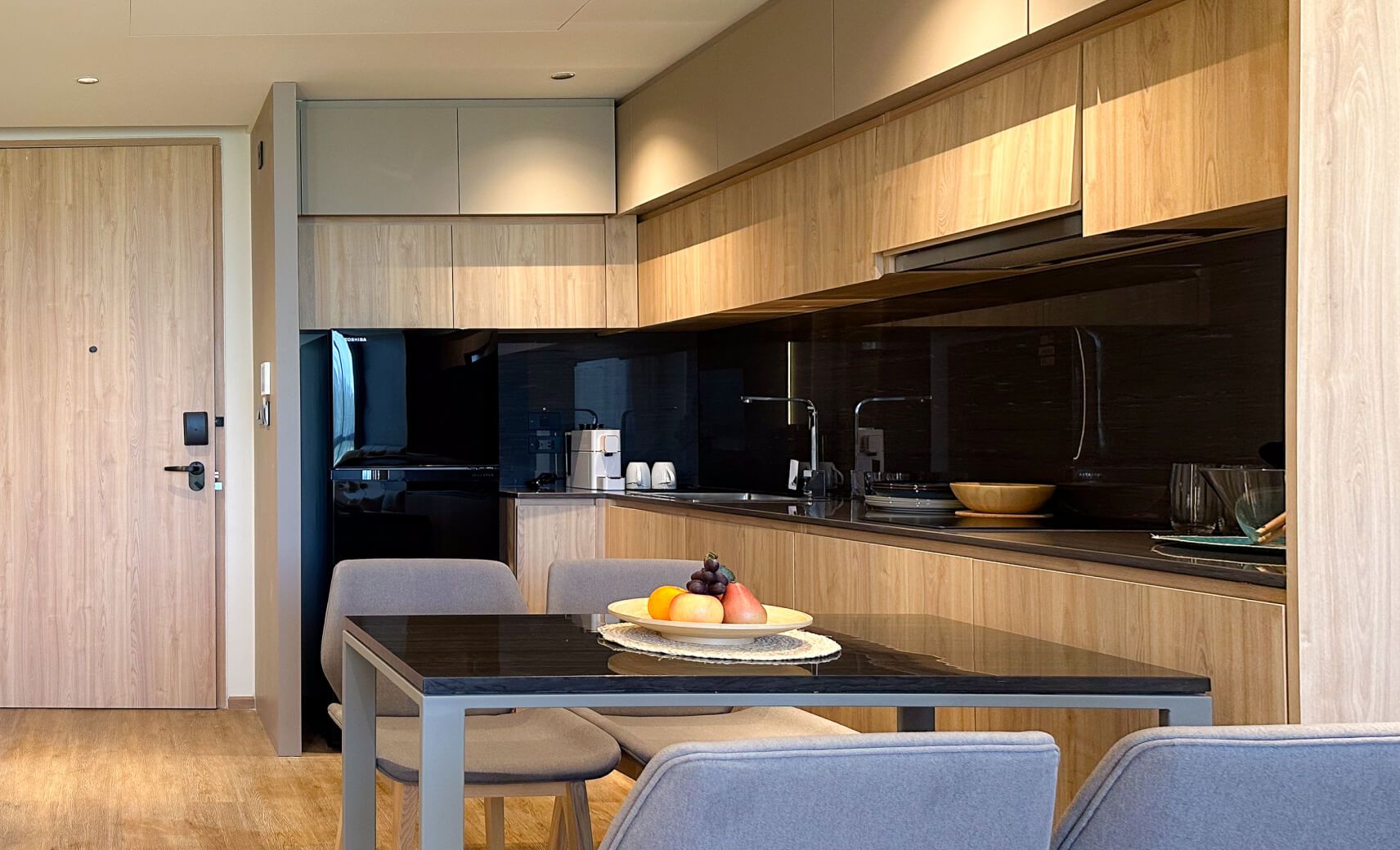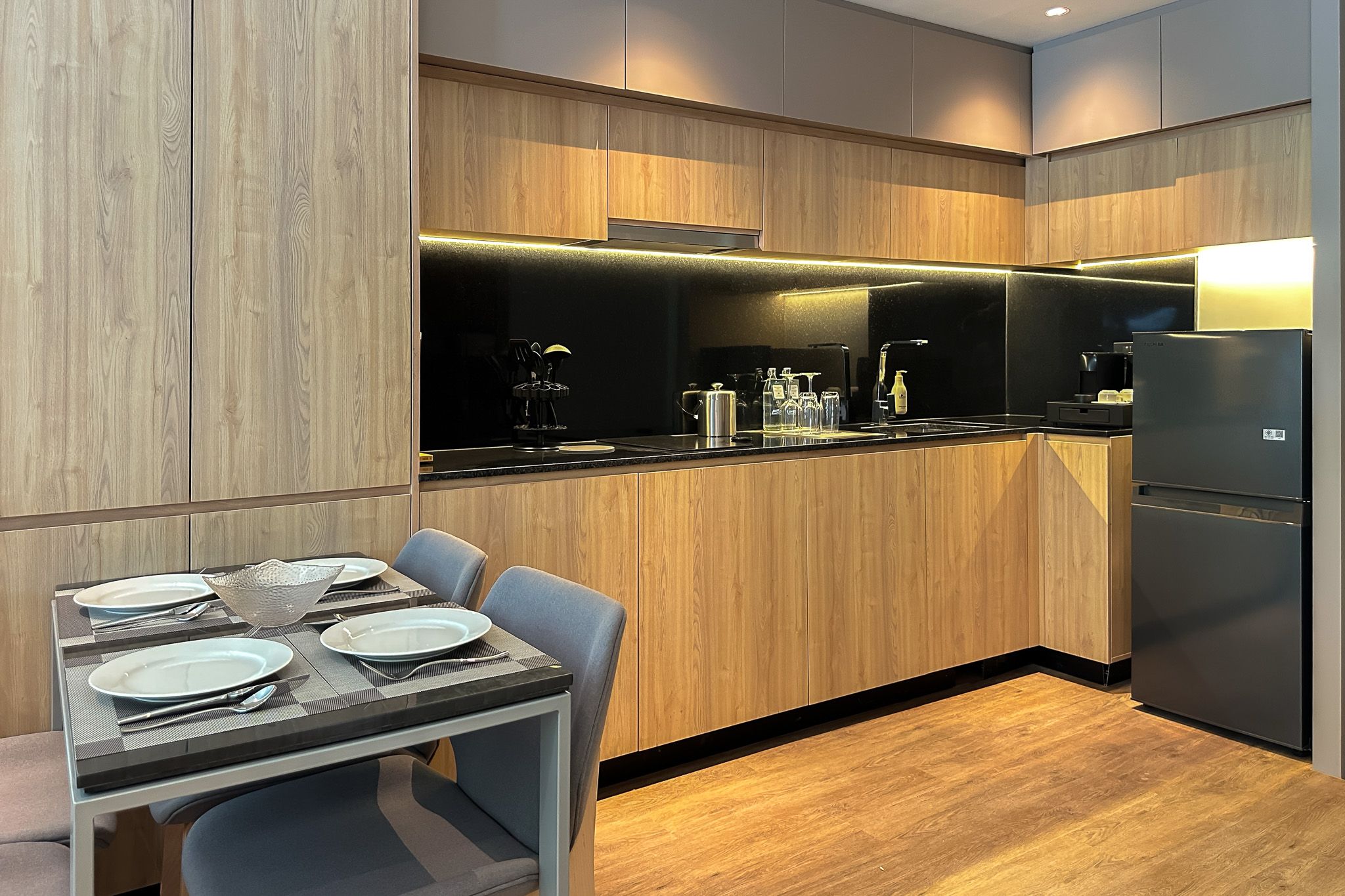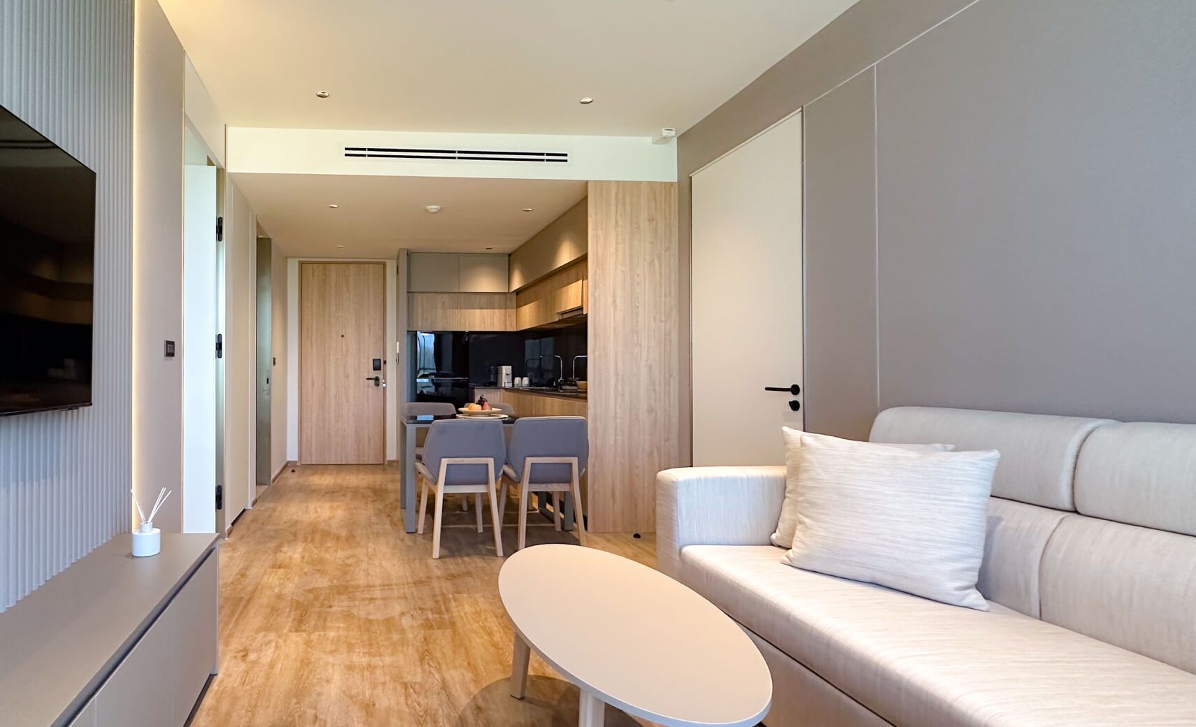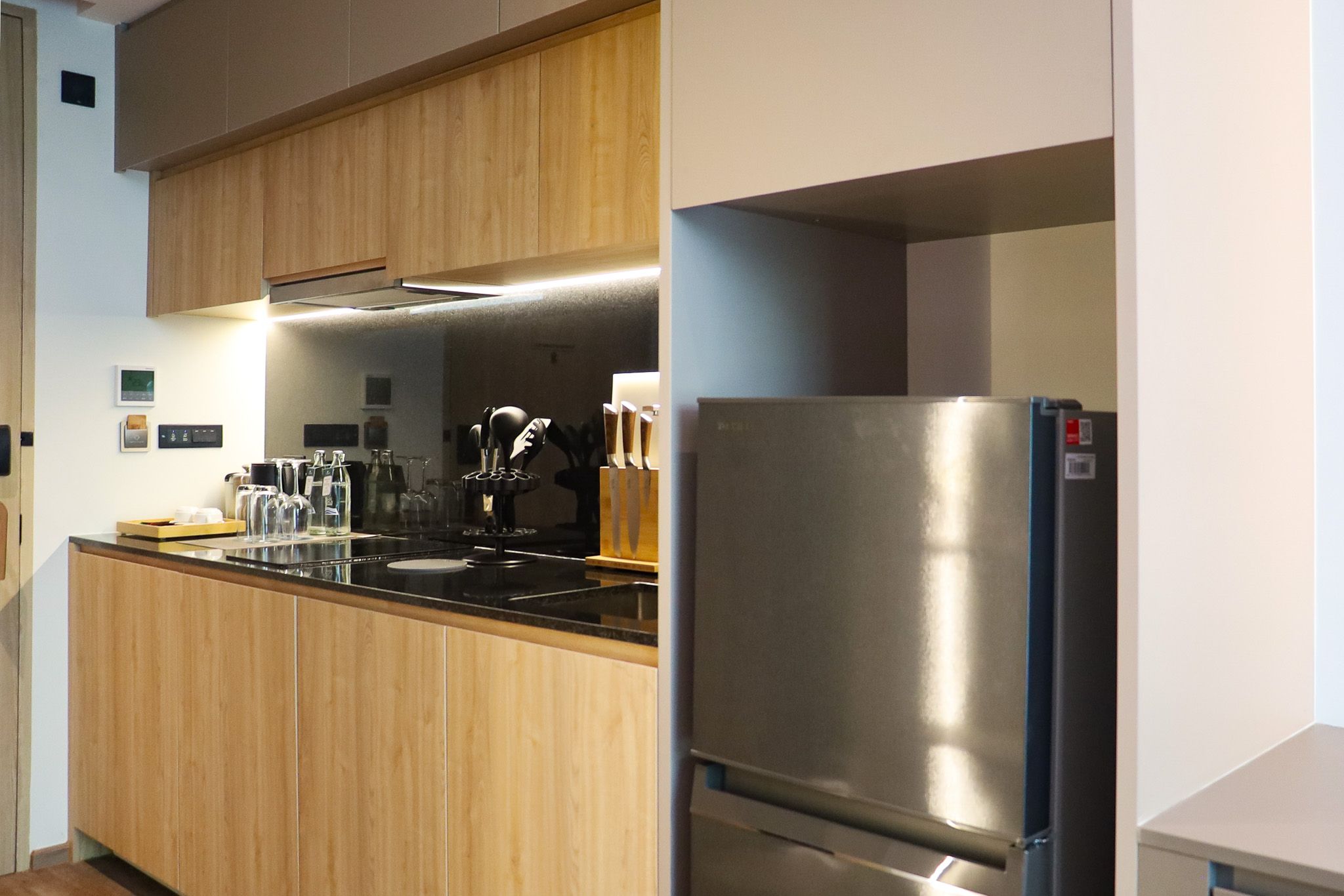Номер включает спальню с двуспальной кроватью/2 односпальными кроватями, балкон и гостиную с кухней. Ванная комната оснащена душем, феном, туалетно-косметическими принадлежностями. В числе прочих удобств кондиционер, телевизор, зонтик, сейф, утюг, чайно-кофейный набор, халаты и тапочки.