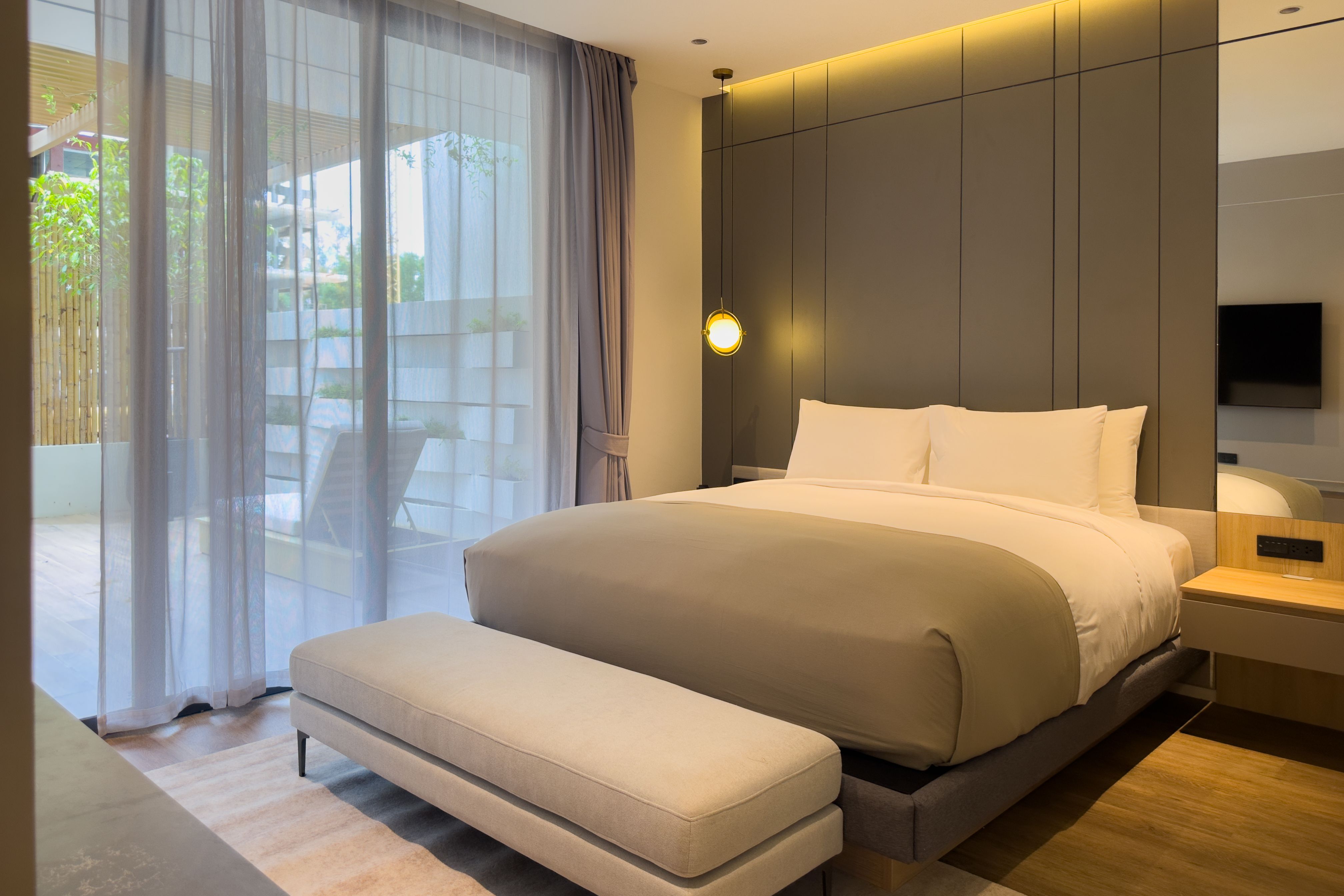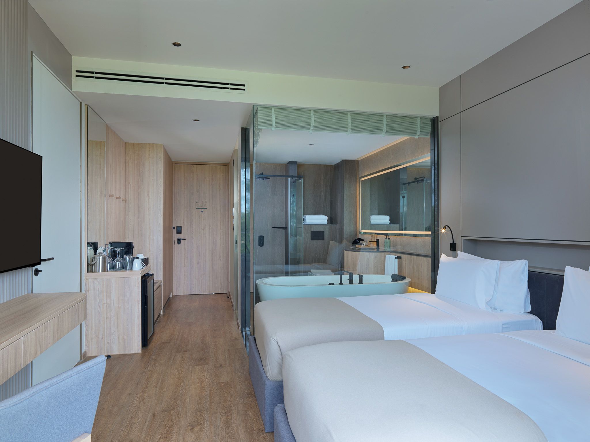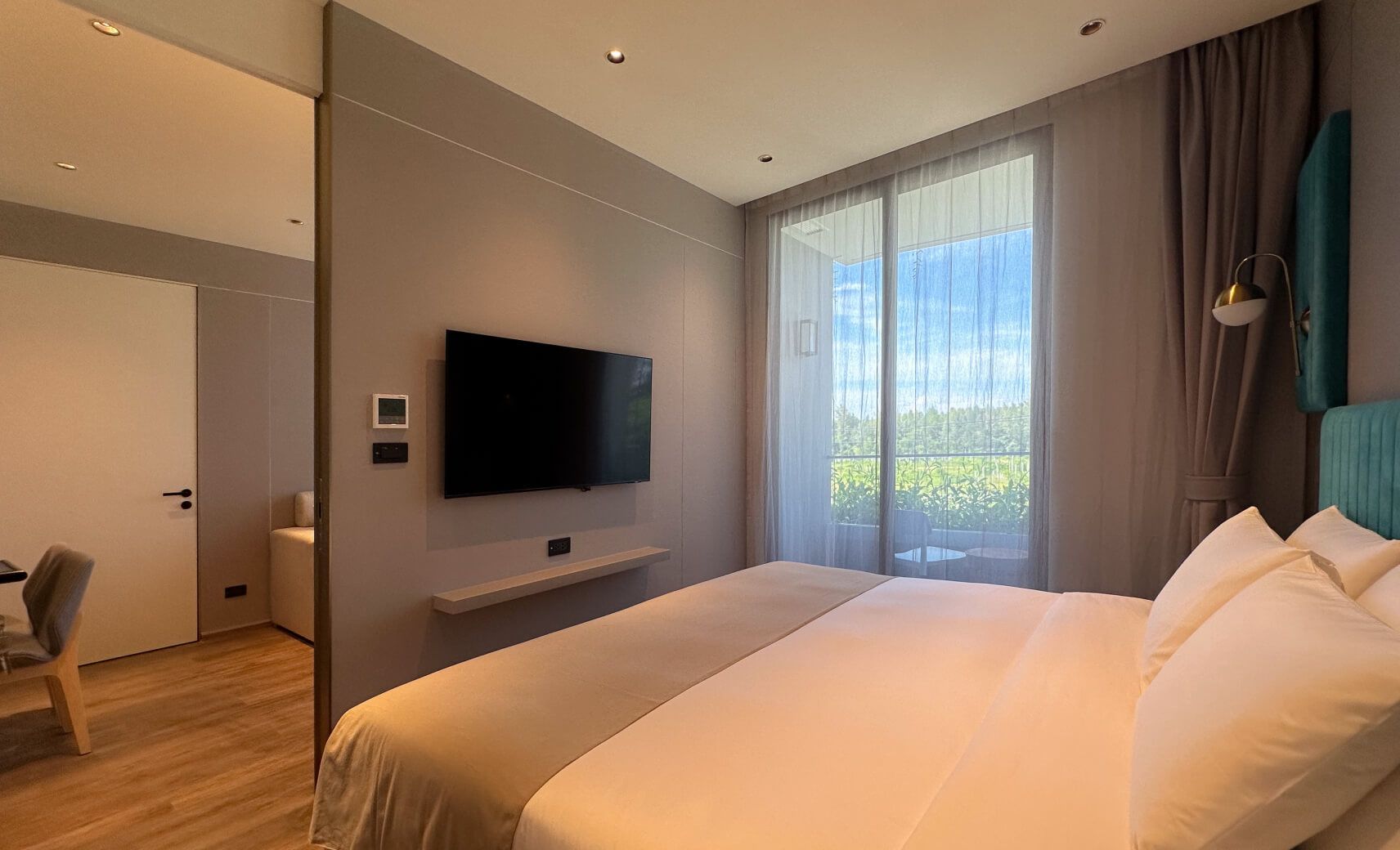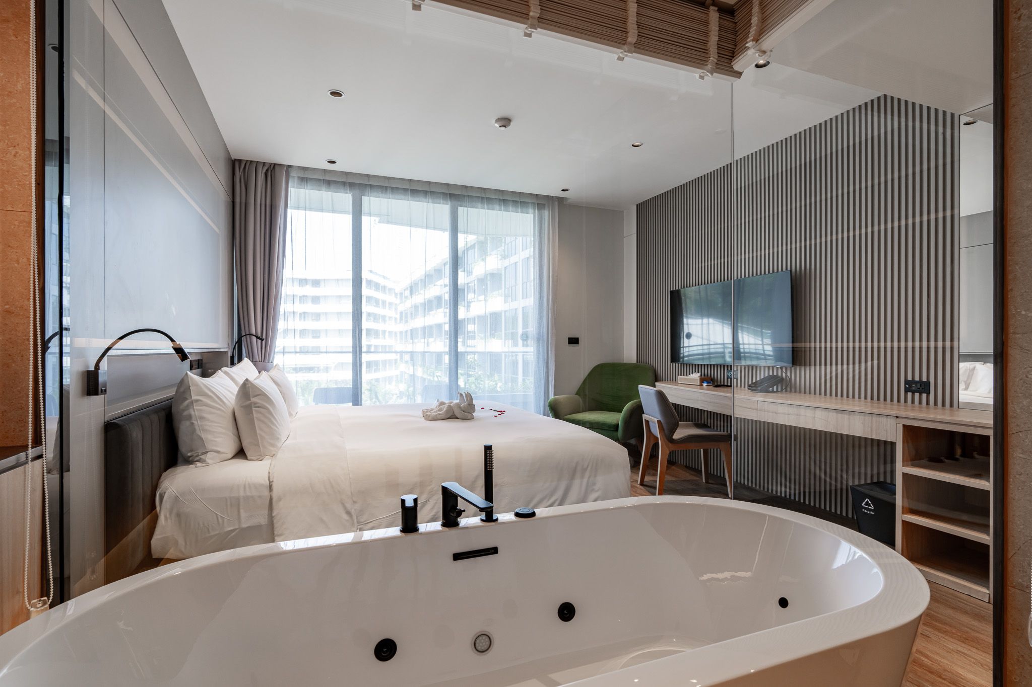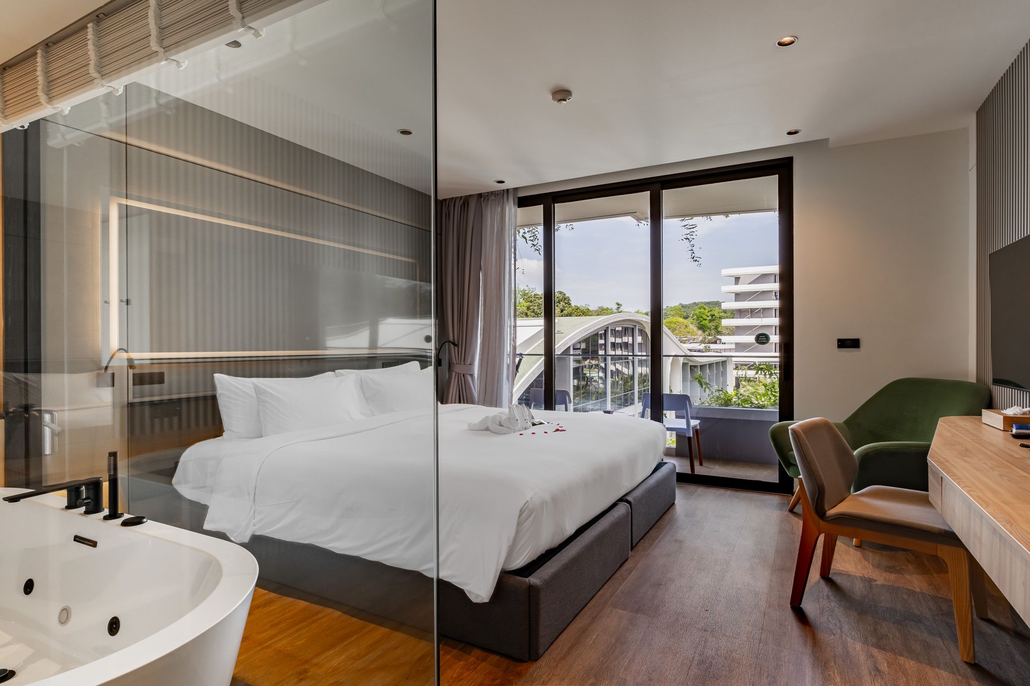 Однокомнатный номер с балконом. В комплектации двуспальная кровать/2 односпальные кровати, письменный стол, кондиционер, телевизор, мини-холодильник, утюг, зонтик, сейф, набор для приготовления чая и кофе. Ванная комната с джакузи и душем, предоставляется фен, набор гостиничной косметики, халаты, тапочки.